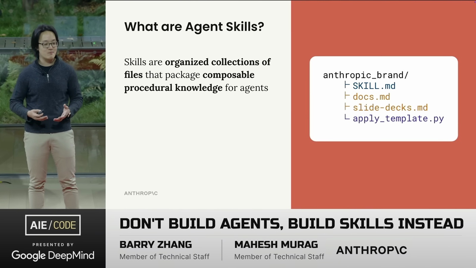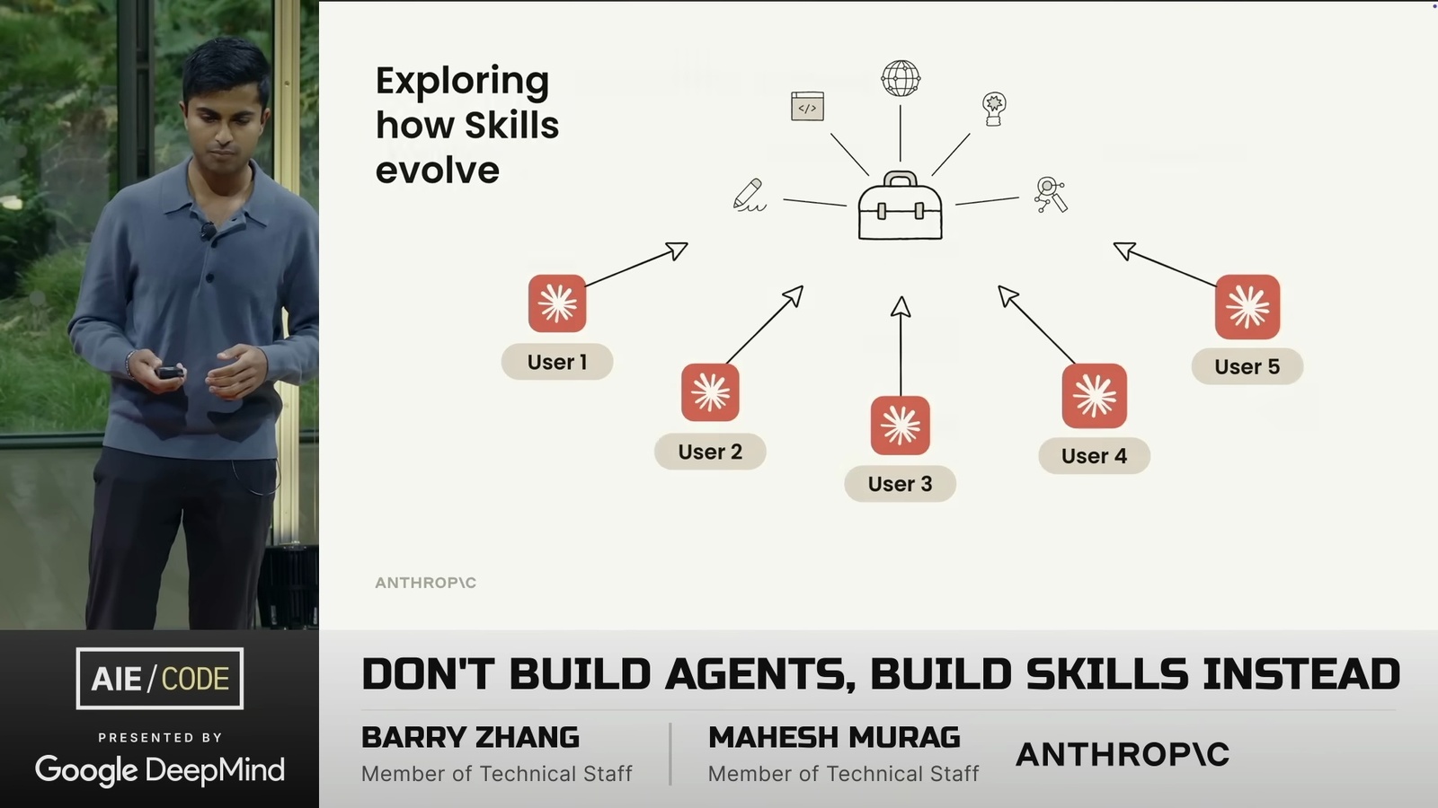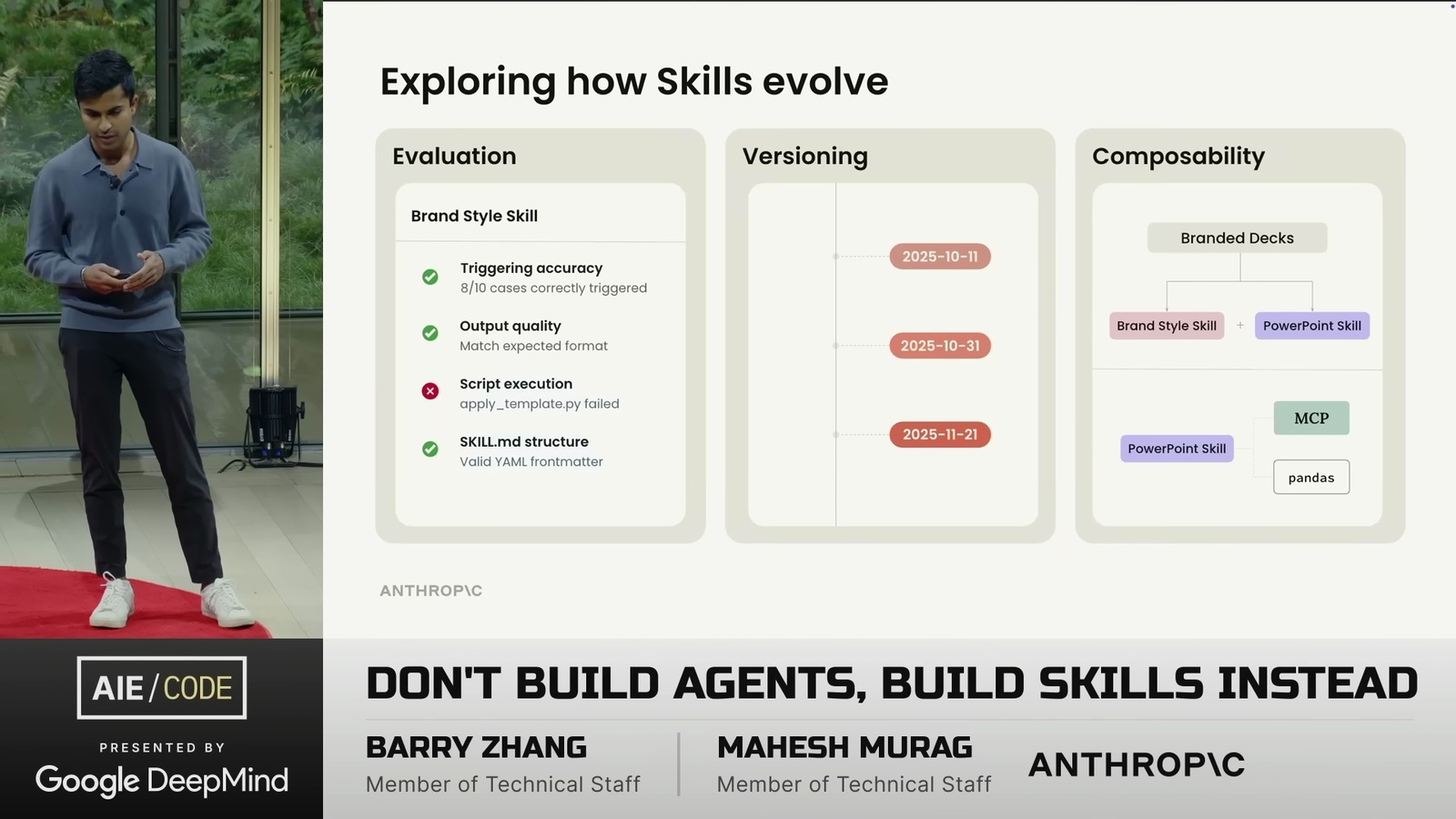 看了一場 Anthropic 的演講 Don’t Build Agents, Build Skills Instead,由 Barry Zhang 和 Mahesh Murag 兩位 Anthropic 工程師主講。這是我將影片轉成逐字稿的全文: ihower.tw/watch/dont_build_agents_build_skills_instead