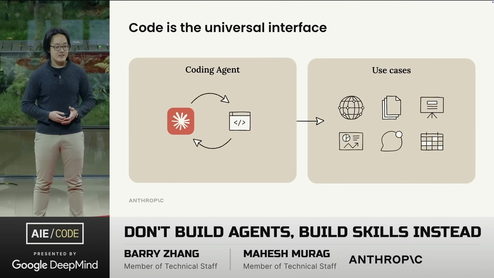 蠻精煉的一場演講。對我來說最大的啟發是: 與其花時間在 Agent 架構上,不如把領域知識好好整理成 Skills,這才是真正能累積和複利的東西。所以別再從零打造 Agent 了 — 把精力花在打造 Skills 上吧。