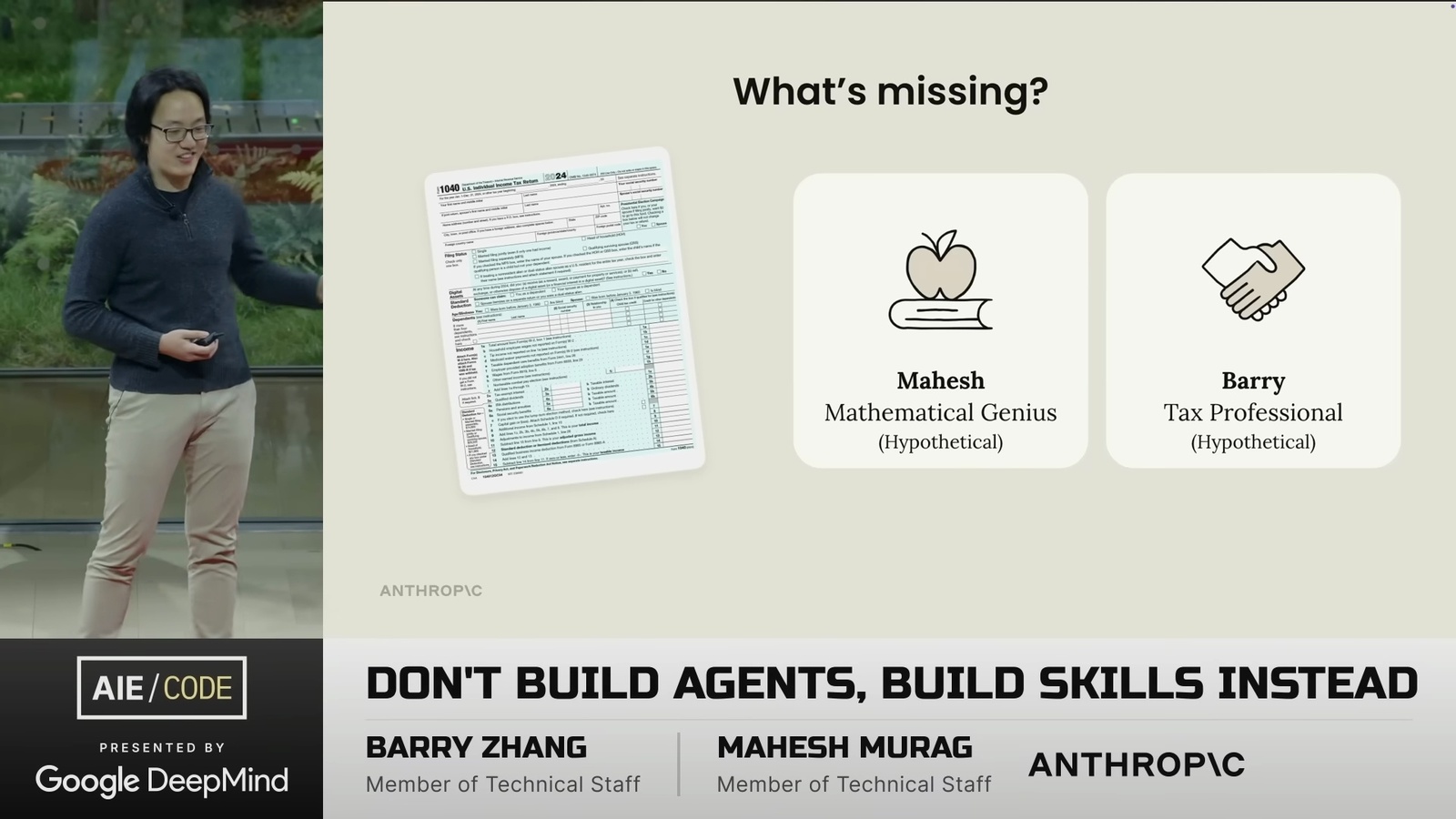 Agent 很聰明,但缺乏專業知識。演講者用了一個有趣的比喻: 你要報稅,會選一個 IQ 300 的數學天才,還是一個經驗豐富的稅務專家?